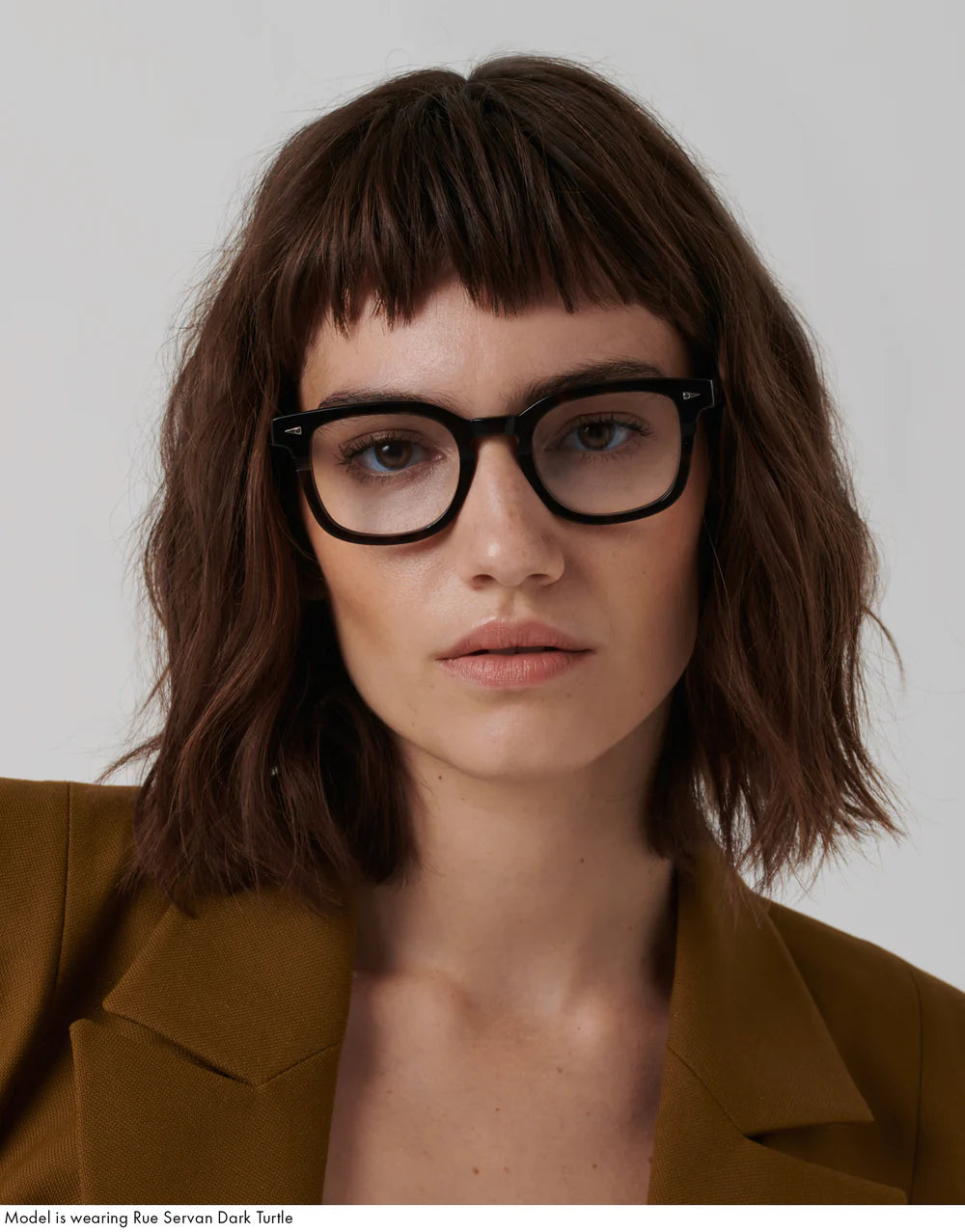 Slender from the front and the side, Rue Servan is a unisex frame with thoughtful design details. A subtle stripe of raw acetate runs along the lenses’ horizon line, while the sculpted keyhole bridge, beveled temples, and triangle accents add layers of distinction.