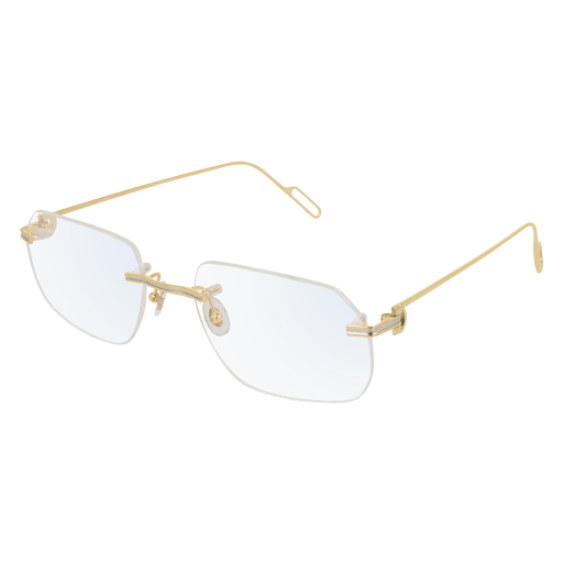 Contemporary reinterpretation of the iconic styles launched in 1983 Light rectangular rimless shape enriched by the iconic combination of the Godron and the C de Cartier as aesthetical and functional element of the hinge Double C Décor signature on the nose pads