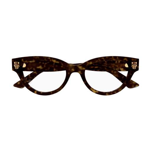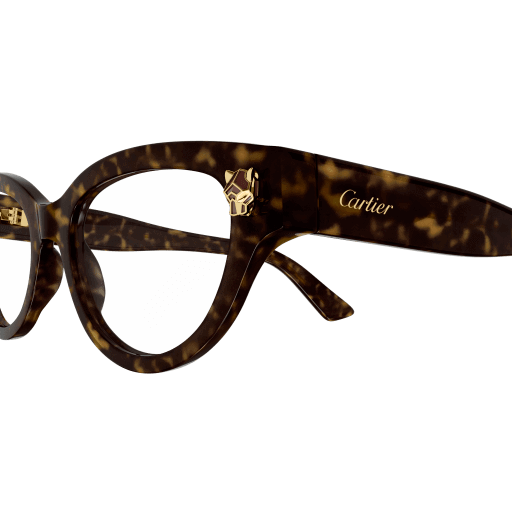 New Panthère aesthetics characterized by a new three-dimensional Panthère head with geometric facets, enriched by enamel details. Modern cat-eye shape in acetate. Enamel detail ton-sur-ton with the acetate colour and and precious finish in gold.