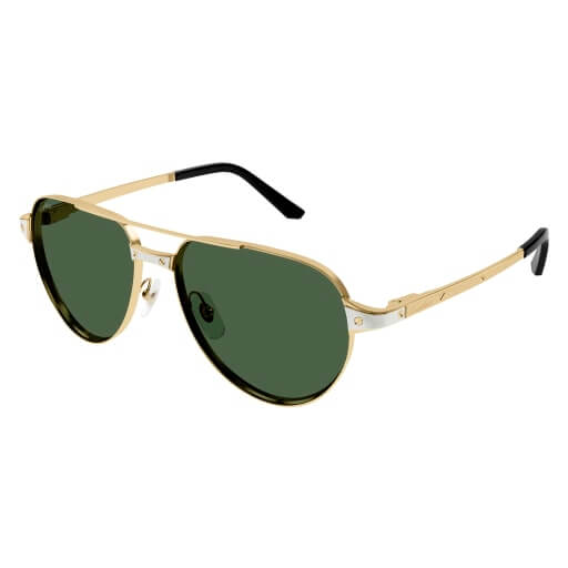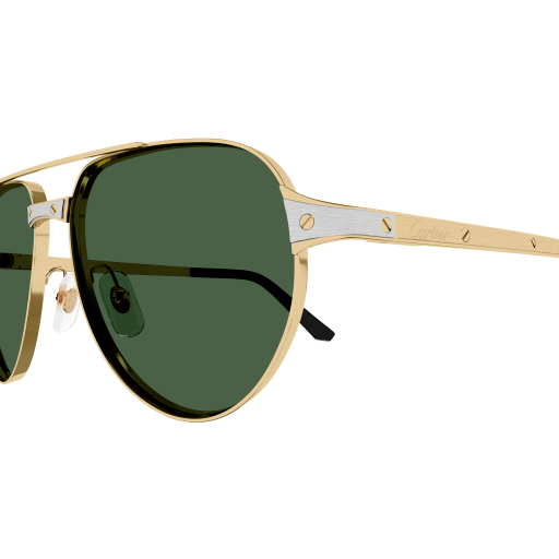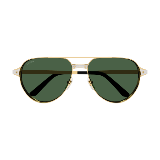 Masculine double bridge pilot shape to complete the Santos Evolution family with a bold bi-layer construction. Metal front enriched with an aesthetic flat metal component to enhance the Iconic Santos Screws and reproduce the watch’s shape. Recognizable Santos temples also enriched by the Santos screws décor and the Cartier logo engraved. The acetate temple tips present the iconic Screw Dècor. Precious finish in gold and platinum thanks to the bi-galvanic treatment.