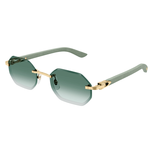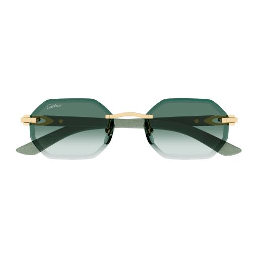 Contemporary yet sophisticated temples in wood or horn enriched with the iconic Décor C detail as a functional and aesthetic element of the hinge. Narrow polygonal shape with faceted lenses in a rimless construction to ensure a modern and contemporary look. Cartier logo plaque on temple tips as elegant signature of the Maison. Precious finish in gold or platinum.