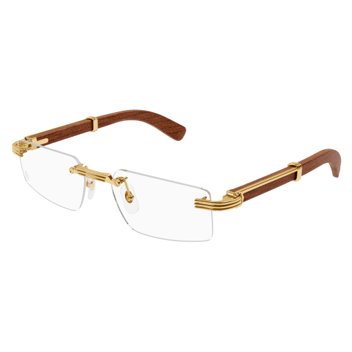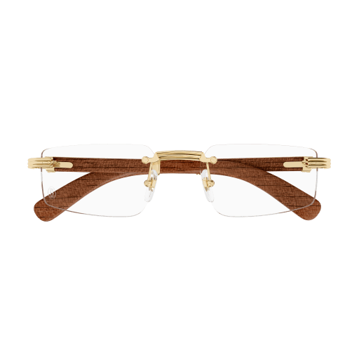 Additional shape of the existing Première aesthetic in wood or horn with the iconic C de Cartier and Godron detail enriching the temples. New easy-to-wear edgy rectangular shape in rimless construction to ensure an alegant and masculine look. Double C Décor logo plaque on temple tips as elegant signature of the Maison. Precious finish in gold (1 sku finished with a sophisticated bi-galvanic treatment).