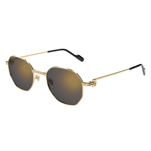 New lighter construction of Première de Cartier metal frame characterized by a sophisticated thinner version of Godron and C de Cartier details on the hinge for an easy-to-wear yet iconic look. Contemporary and unisex polygonal shape in full rim construction combined with light metal temples. Zeiss colourful solid lenses complete the style for a young yet sophisticated look. Precious finish in gold, Cartier logo plaque on acetate temple tips and Double C Décor on the nose pads.