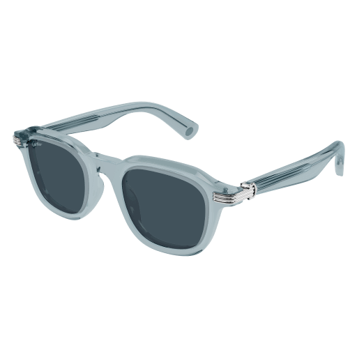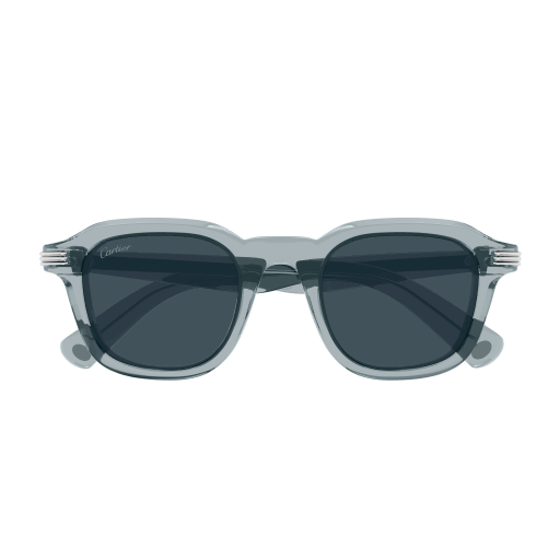 Elevation of the Première acetate construction characterized by a see-through metal wire core decorated with the iconic Godron detail along the temples. Modern squared shape enriched by the iconic combination of the Godron and the C de Cartier details as aesthetic and functional element of the hinge. Transparent acetate colors on some SKUs further enhance the wire core detail embellished by the Godron icon. Precious finish in gold or platinum and Cartier double C logo plaque on temple tips inspired by the vintage styles.