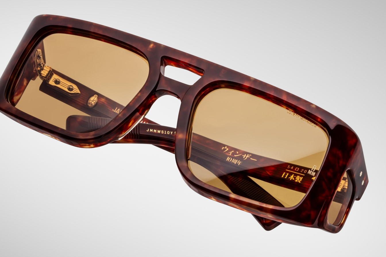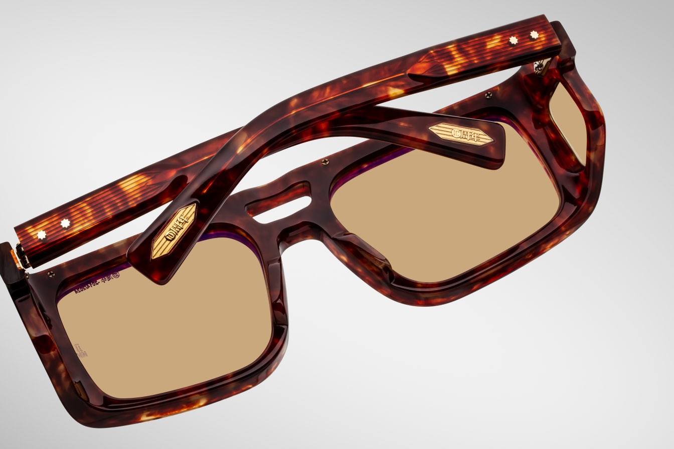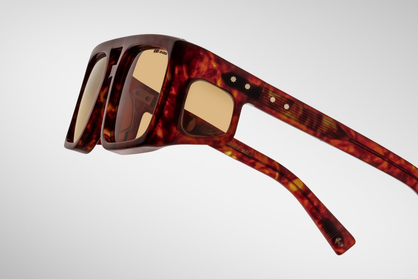 Originally released Spring 2019, the epitome of big boss energy returns, bold ’50s-inspired spectacles re-imagined for the Decade Collection, produced in celebration of our 10-year anniversary, now boasting a powerful rectangular frame with distinctive double-bridge and lensed eyeshields, complemented by new wirecores with Art Deco-inspired hairline details, and temple tips featuring polished metal plaques with special ‘10’ marking.