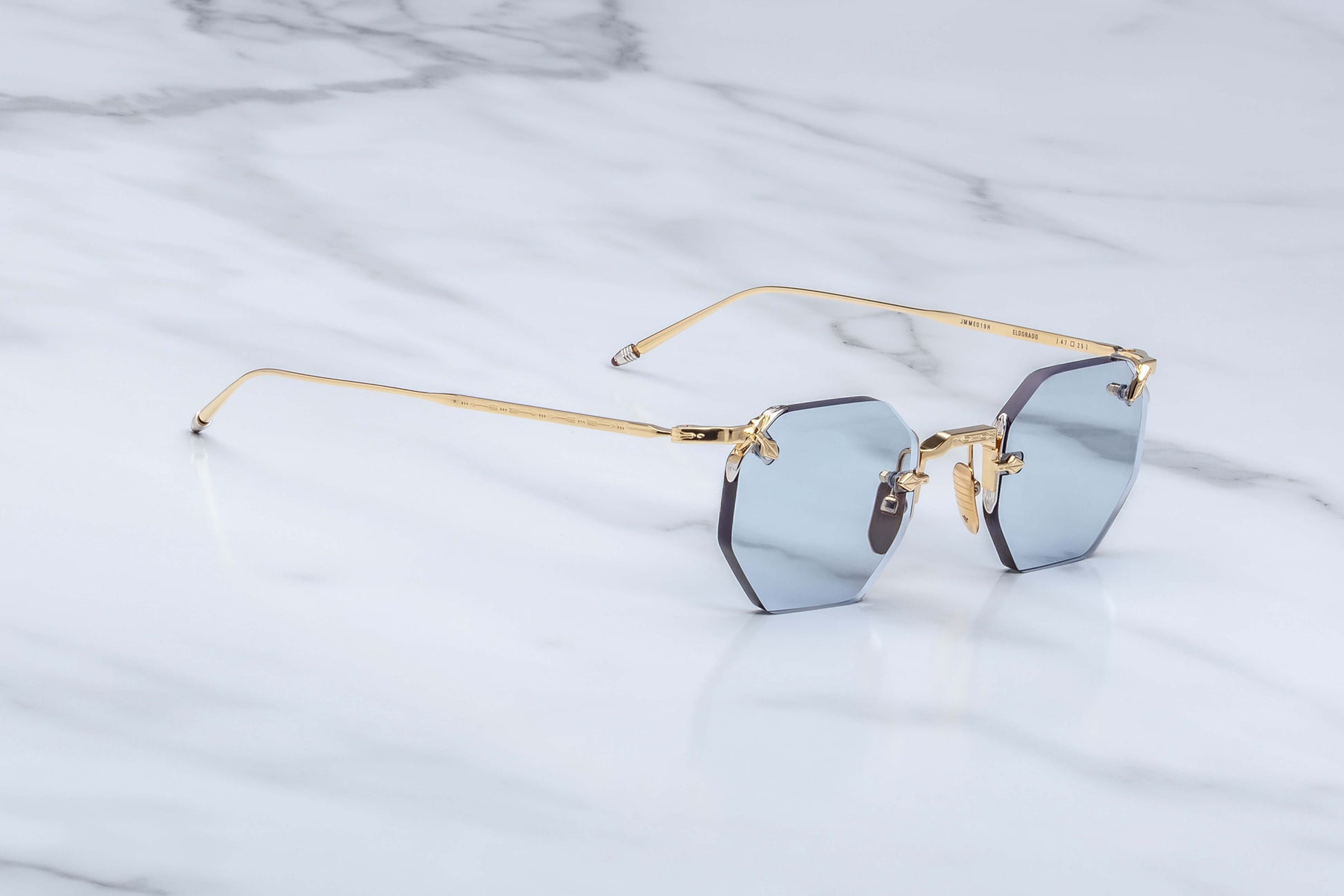1930's inspired octogonal rimless frame construction A sharp shooter on the straight and narrow, you watch these dusty streets through rimless ‘30s-inspired spectacles, featuring high set temples and solid octagonal lenses, which silently remind observers that you are the fearless gun-for-hire, not the drunken deputy.