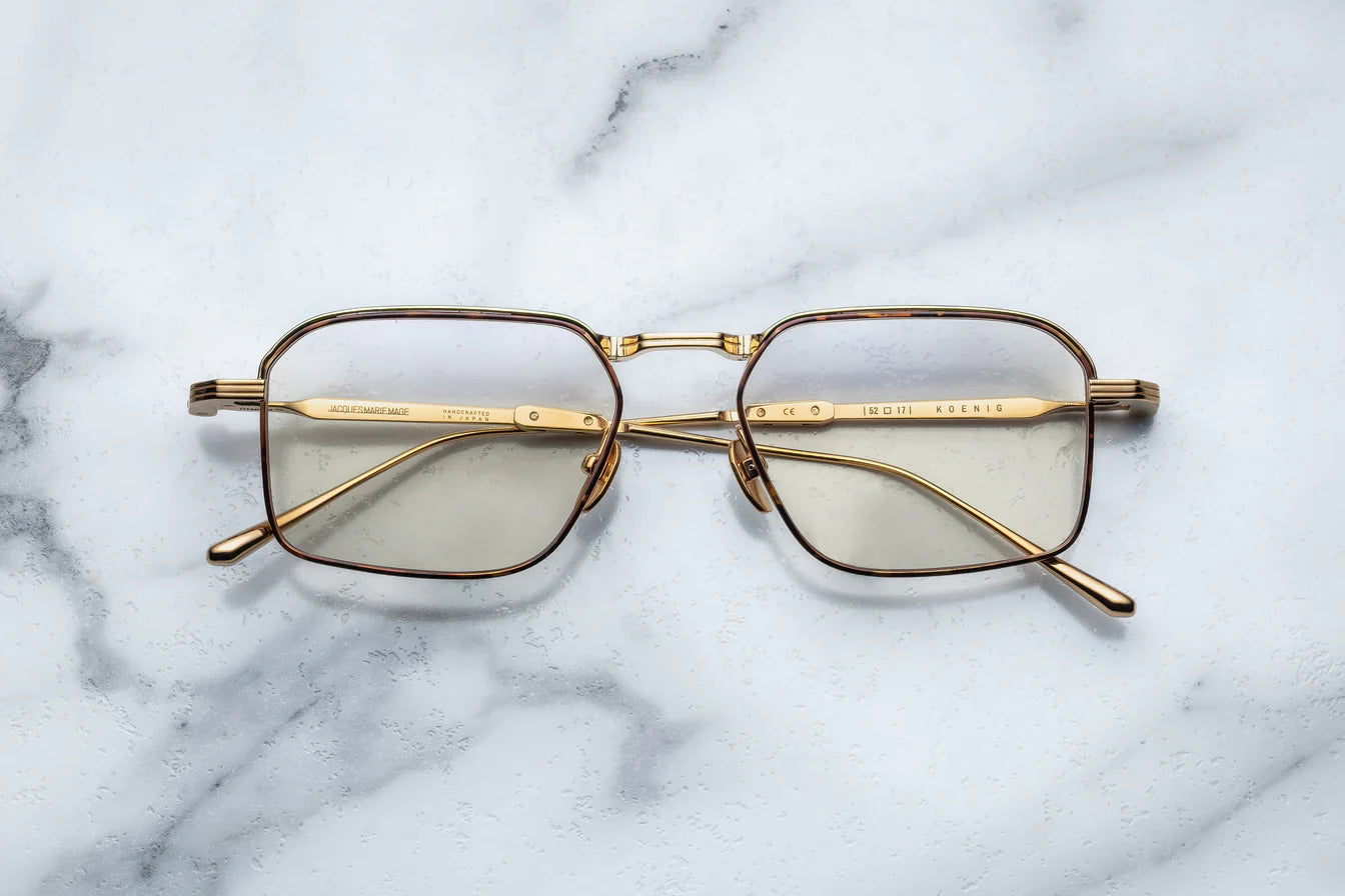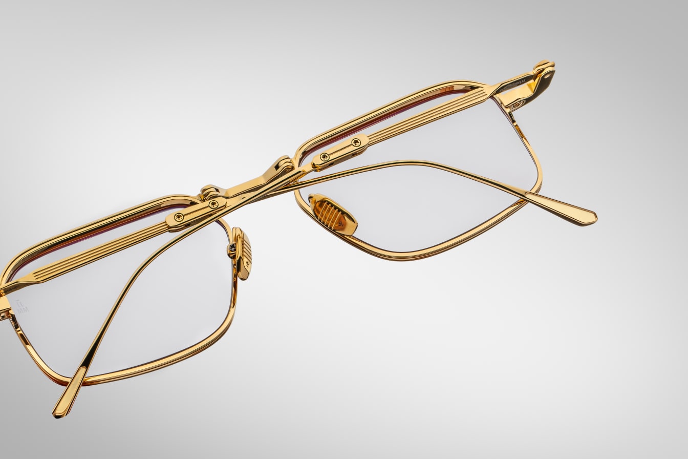 Classic ’60s-inspired folders handcrafted in Japan using 100% beta titanium, a sophisticated rectangular shape with a medium fit, featuring hairline-engraved wire rims, tailfin-shaped temple tips with recessed volumes, and extraordinary polished metal and epoxy details