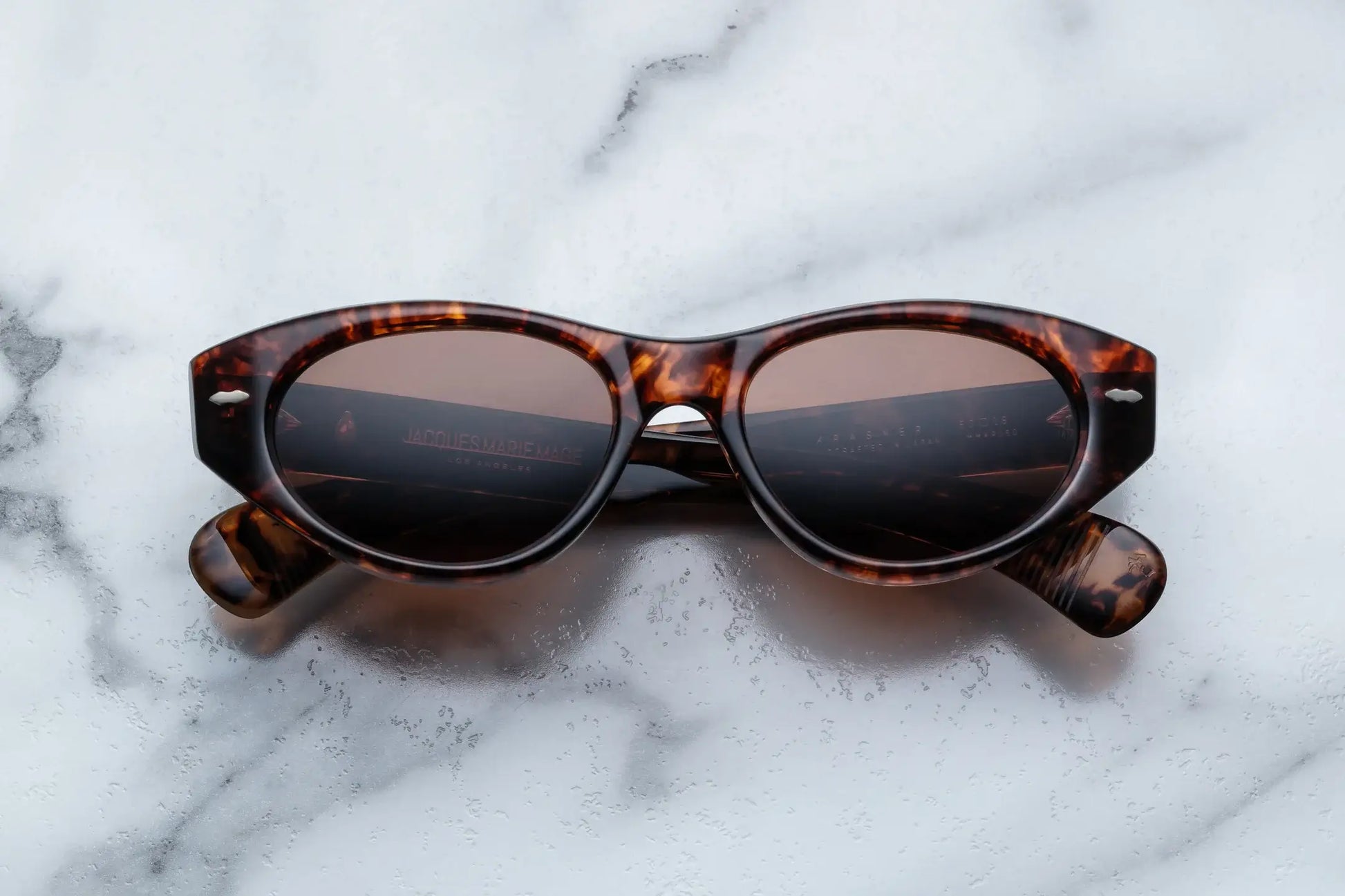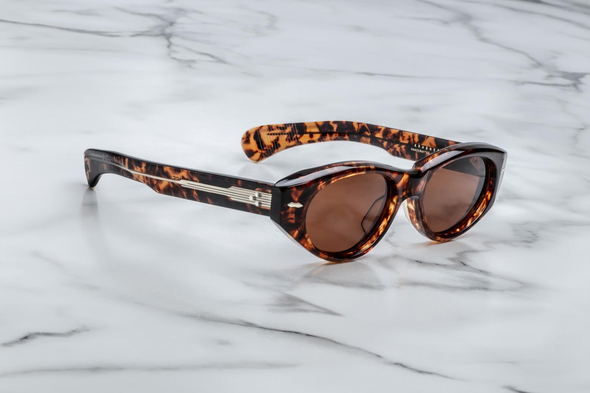 Soft, mid-size cat-eyes with oval lens shape, featuring precious metal double-arrowhead front pins and softly rounded paddle temples.