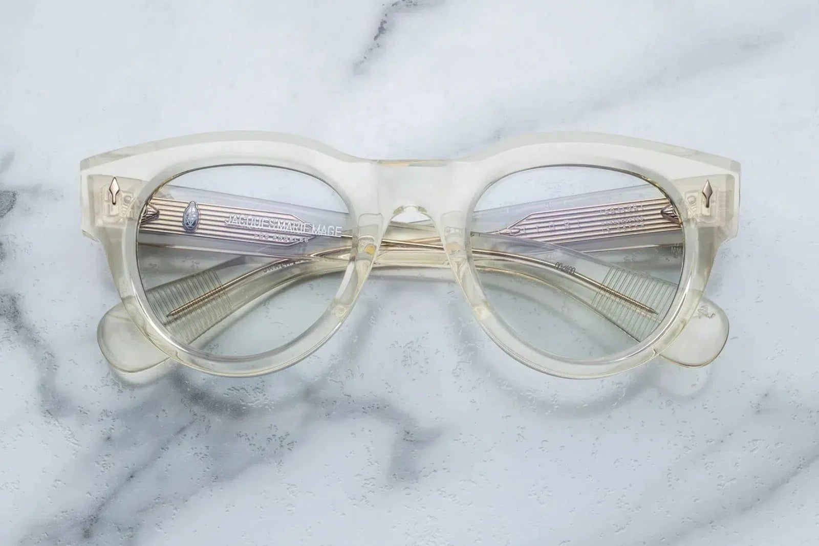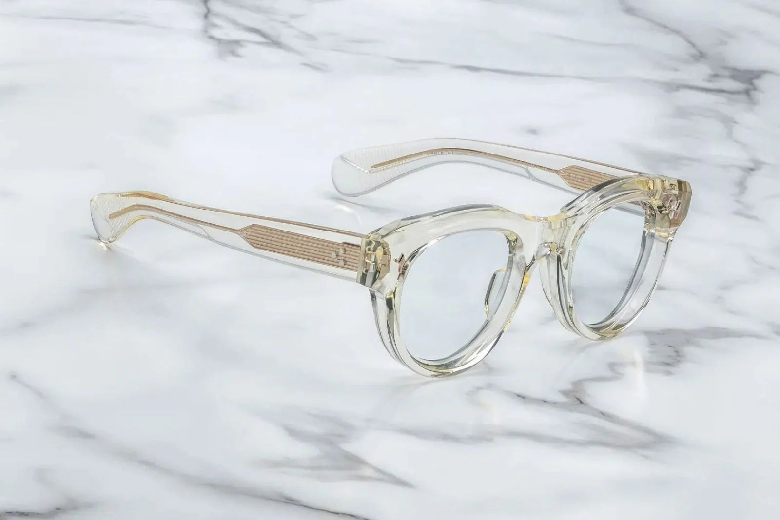 CRYSTAL 10MM CURED CELLULOSE ACETATE FRAME WITH CUSTOM DOUBLE LAMINATED ACETATE TEMPLES FEATURING PRECIOUS METAL HARDWARE AND GREEN LENSES