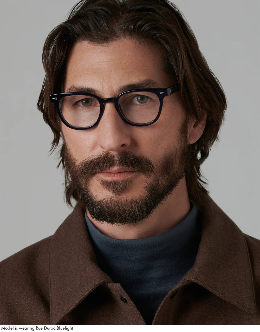 With a slender front silhouette and thicker side depth, Rue Duroc is a relaxed unisex frame with an understated 50s feel. Available in a variety of colorways, this all-purpose classic features a keyhole bridge, beveled temples, and geometric corner accents.