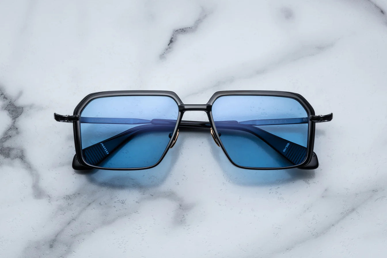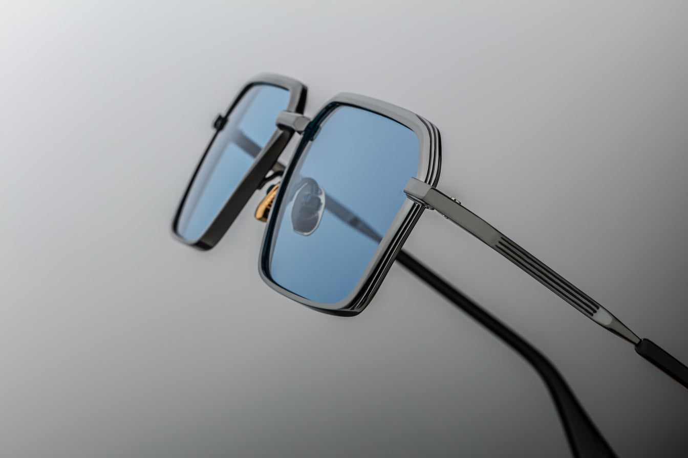 Sleek rectangular titanium spectacles, inspired by the late ’70s, featuring a modern V-shaped profile, custom hidden hinges, refined hairline epoxy accents, and plant-based acetate temple tips.