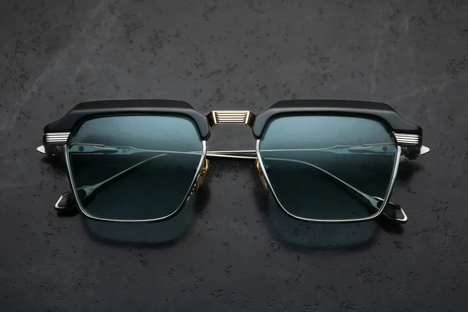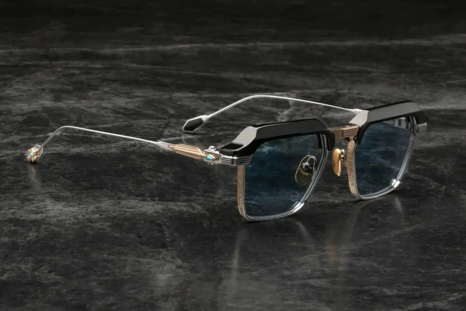 The first ever Last Frontier combo style, these square ’50s-inspired spectacles with prominent acetate top bar and finely-engraved eye rims feature a sculptural arrowhead temple motif complemented by temple-tips with ‘thunderbird’ cameos embellished with hand-shaped gemstone inlays. Within this bastion of wilderness awhirl with the winds of change, watch from the protection of your county seat as the frigid winters of the soul move beyond the continental basin. Brace for all that stirs within the heart; enjoy the quiet moments and wild places in classic, ’50s-inspired combo spectacles with a prominent acetate top bar, square titanium lens rims with finely engraved Chimayo textile-inspired designs, and a sculptural precious metal arrowhead temple motif plated in 18k Gold or Sterling Silver with turquoise inlays, and ‘thunderbird’ medallions plated in 18k Gold or Sterling Silver at the temple tips, featuring turquoise inlays.